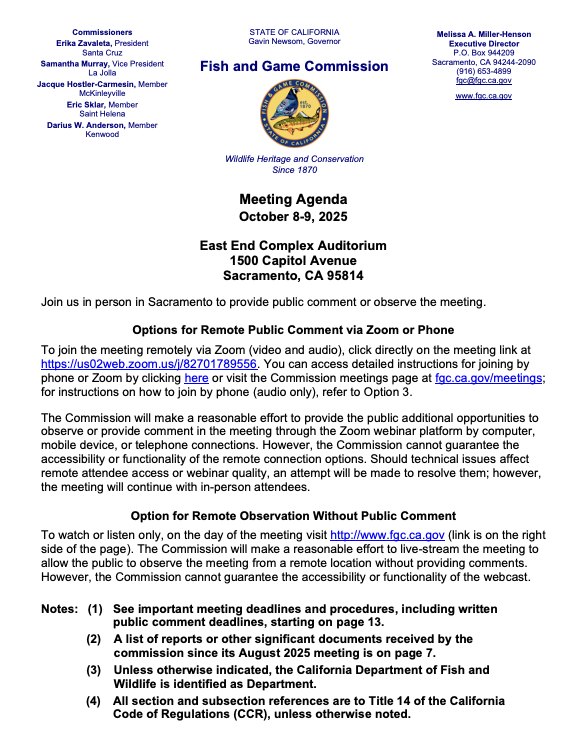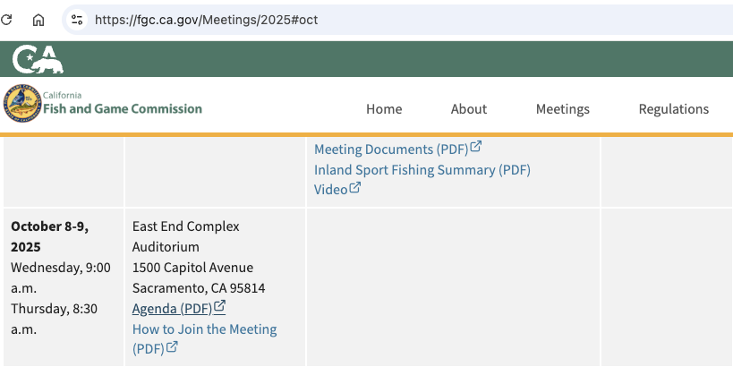 We are now at the final stages and the final meeting prior to voting. The voting will take place in the afternoon in Sacramento at the natural resources building on October 8, 2025. We are calling on all anglers who care about Striped Bass to show up in the afternoon after lunch for the Striped Bass decision. If you cannot attend the meeting in person, you can attend remotely via Zoom.