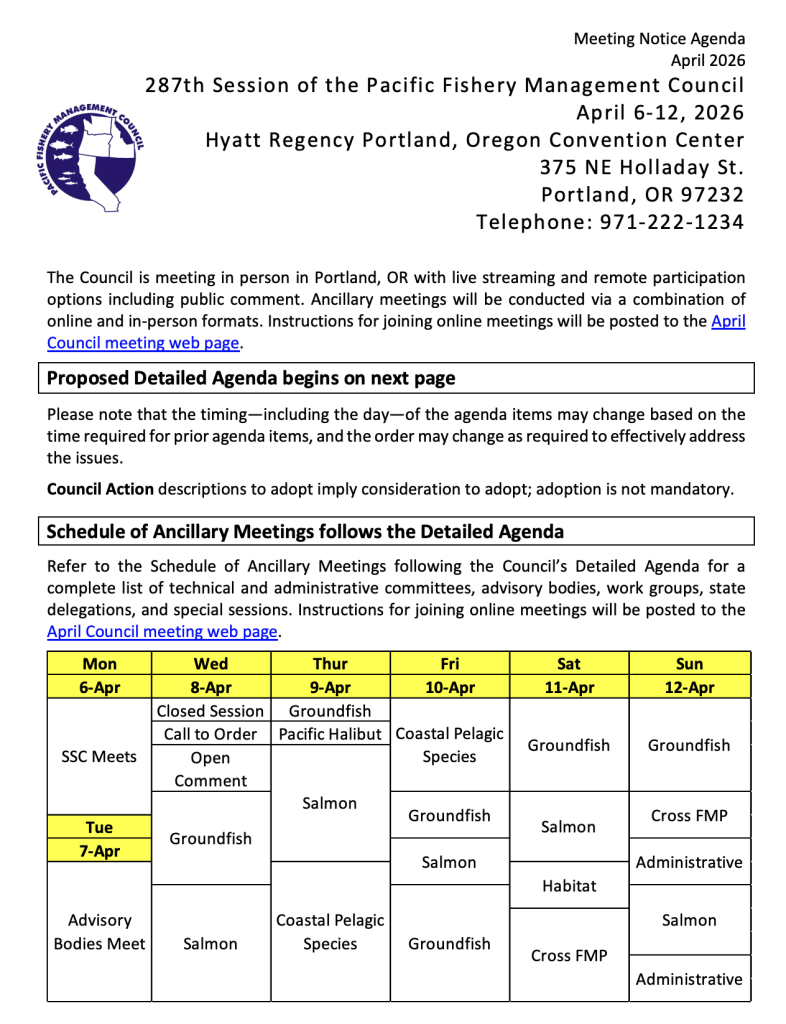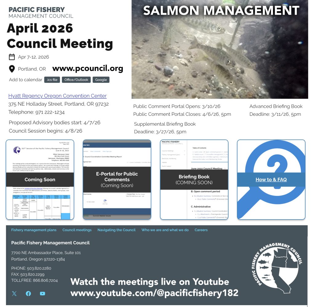 - The PFMC makes changes to the Salmon Season dates or three alternatives each day they are discussed as new information and quotas are considered. Find the new dates for each zone on their website under their Briefing Book for the March Meeting. Look for the C.6.a Supplemental STT Report 1: Salmon Technical Team Report Collation of Preliminary Salmon Management Alternatives for 2026 Ocean Fisheries (this is the latest from Sunday and will be reviewed on Monday.