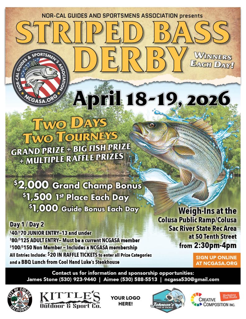 Thank you to the City of Colusa, Kittle’s Outdoor & Sport Co., Johnson’s Bait Tackle and Fly Shop, and Creative Composition for partnering with us on the Derby.